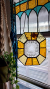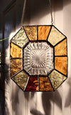 This suncatcher has a small vintage glass textured dish as a centrepiece and is framed with vintage textured amber glass.
