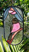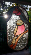 Stained glass suncatcher of a pink Robin on a branch under Eucalyptus leaves and flowers.
