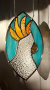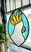 Stained glass suncatcher of a stylised Sulphur crested Cockatoo.